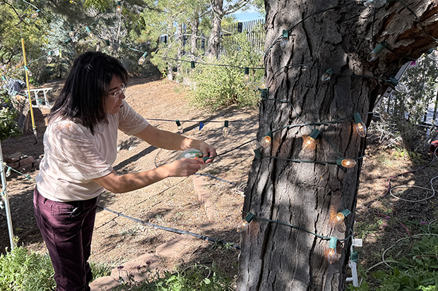 Dina Bello installing lighting in the NMDS area of the ABQ Garden Center in preparation for the Glow 'N' Stroll.