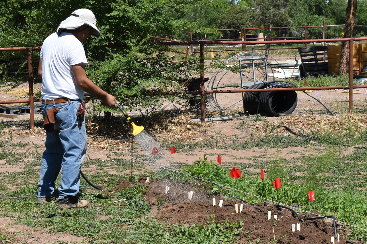 Dina Bello logging the location of each Dahlia tuber to be used for the plot map.